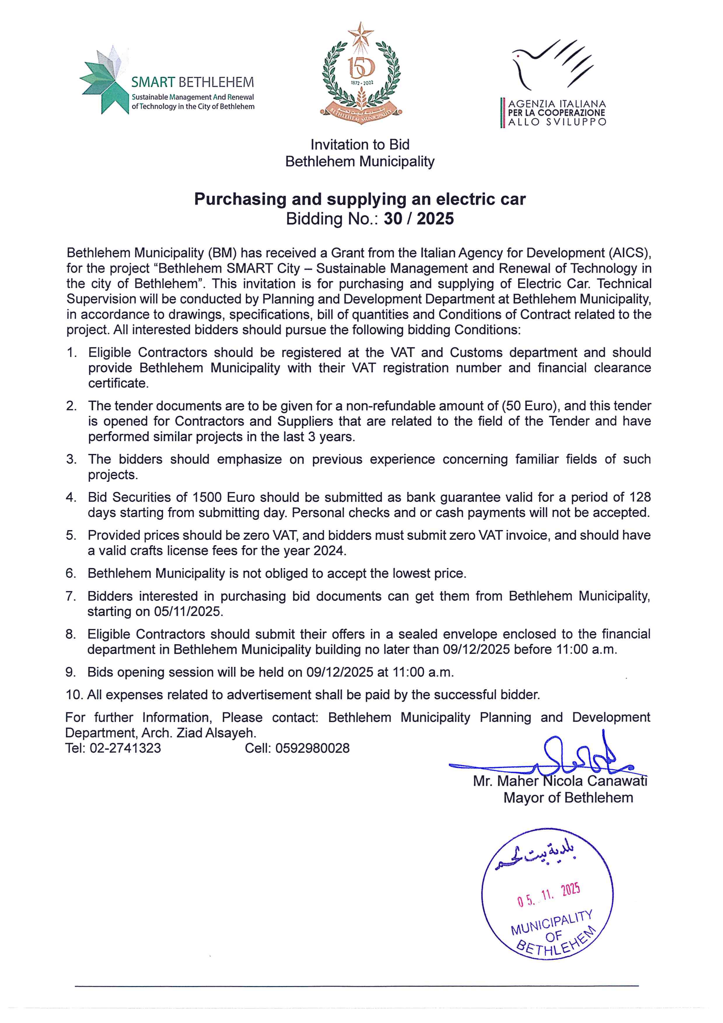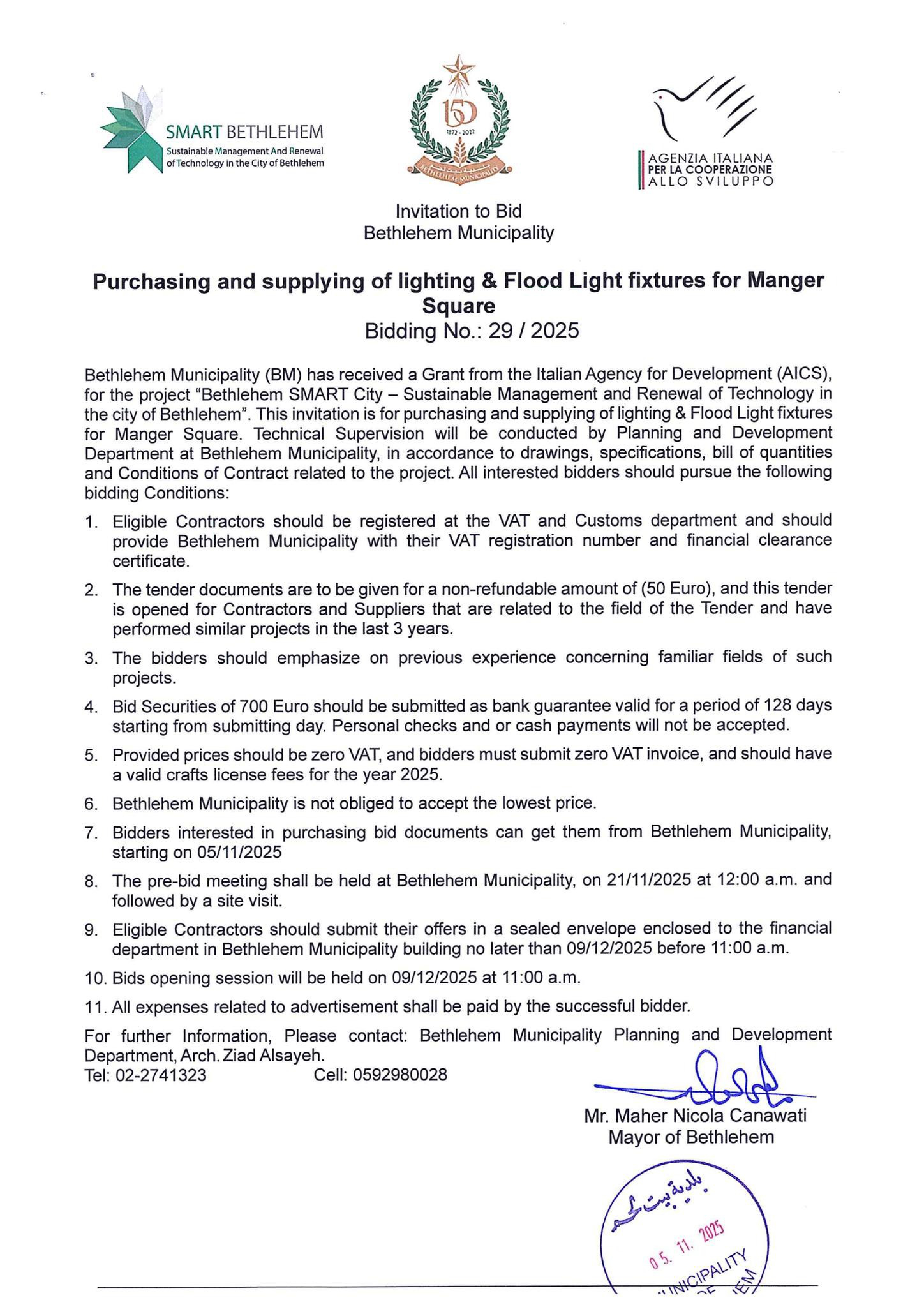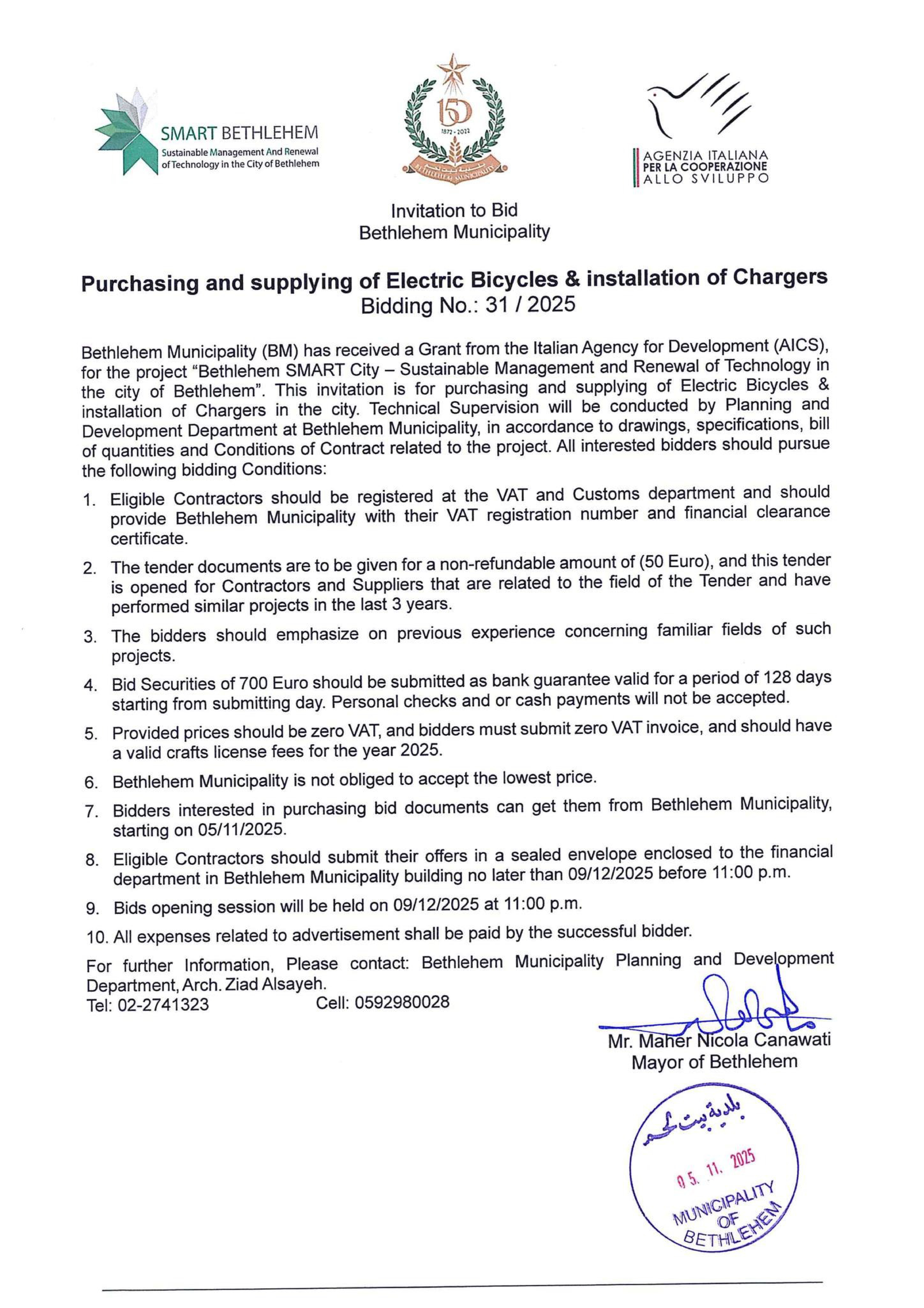 ضمن إطار مشروع بيت لحم مدينة ذكية الممول من قبل الوكالة الإيطالية للتعاون الإنمائي ومن خلال مقاطعة بافيا الإيطالية. تُعلن بلدية بيت لحم عن العطاءات المرفقة وعلى من يرغب بالحصول على نسخة الحضور إلى مبنى البلدية لشراء العطاءات المذكورة وهي: