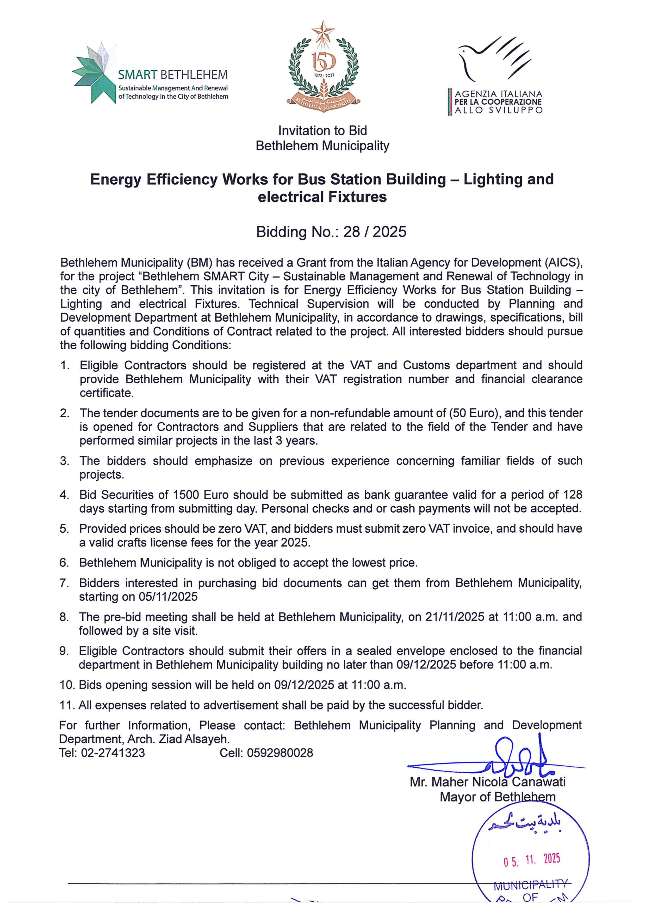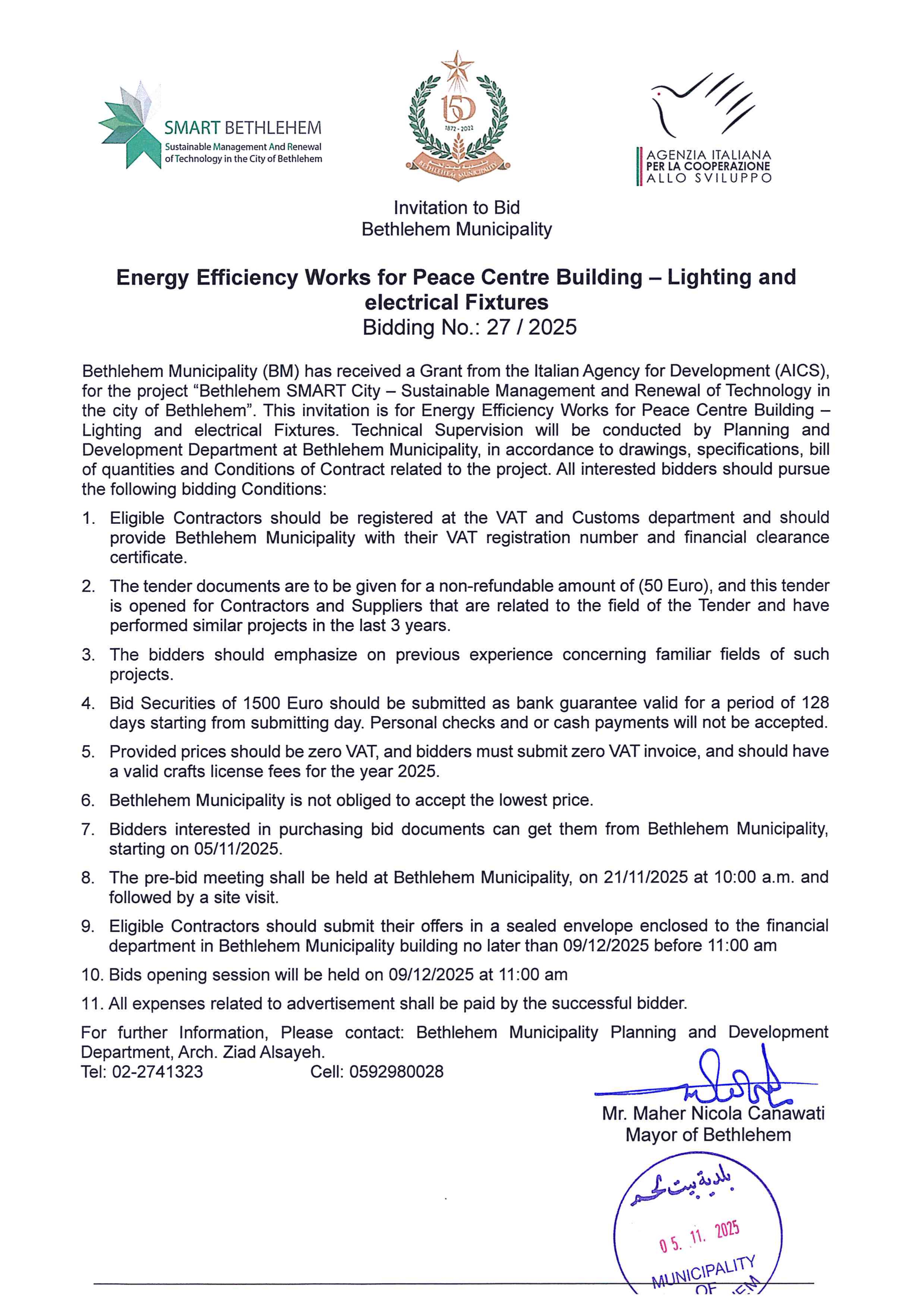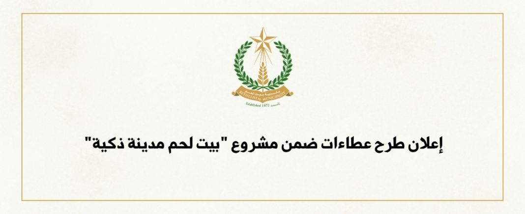 ضمن إطار مشروع بيت لحم مدينة ذكية الممول من قبل الوكالة الإيطالية للتعاون الإنمائي ومن خلال مقاطعة بافيا الإيطالية. تُعلن بلدية بيت لحم عن العطاءات المرفقة وعلى من يرغب بالحصول على نسخة الحضور إلى مبنى البلدية لشراء العطاءات المذكورة وهي: