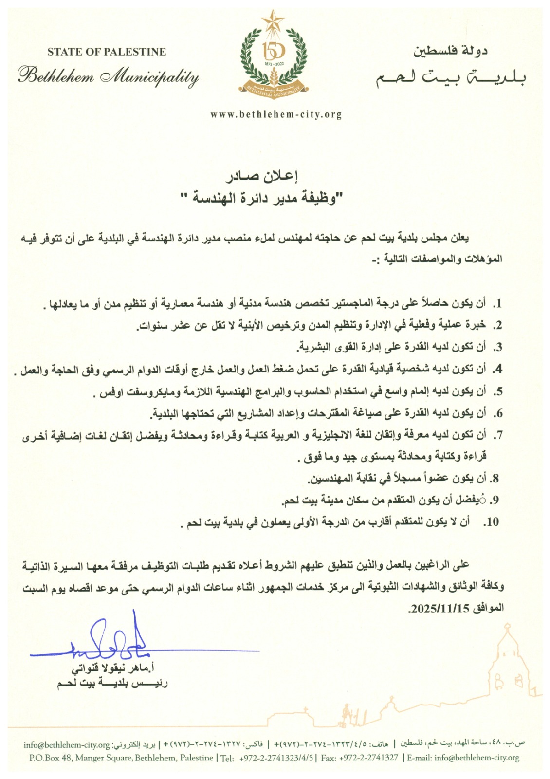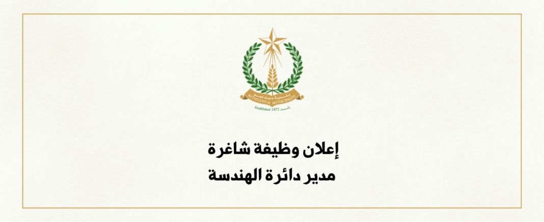 يعلن مجلس بلدية بيت لحم عن حاجته لشغل وظيفة مدير دائرة الهندسة في البلدية على أن تتوفر فيه المؤهلات والمواصفات في الإعلان المرفق.