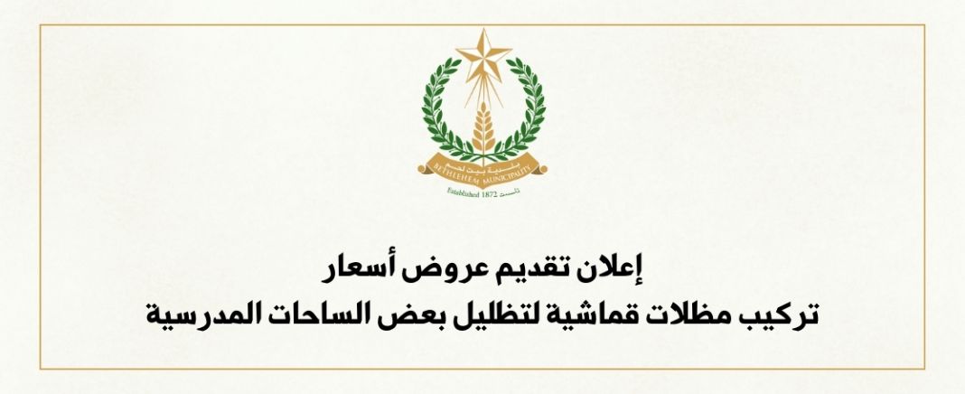 تدعوكم لجنة ضريبة التربية والتعليم لتقديم عرض سعر لأعمال تركيب مظلات قماشية لتظليل بعض الساحات المدرسية، وذلك في موعد أقصاه الساعة 11 صباحاً من يوم الاثنين الموافق 1/9/2025 ويتم التسليم في مكتب لجنة ضريبة التربية والتعليم في بلدية بيت لحم ولن يقبل بعدها أي استدراج لأي سبب كان، على أن يتم مراعاة البنود أدناه في المرفق عند تقديم العرض.