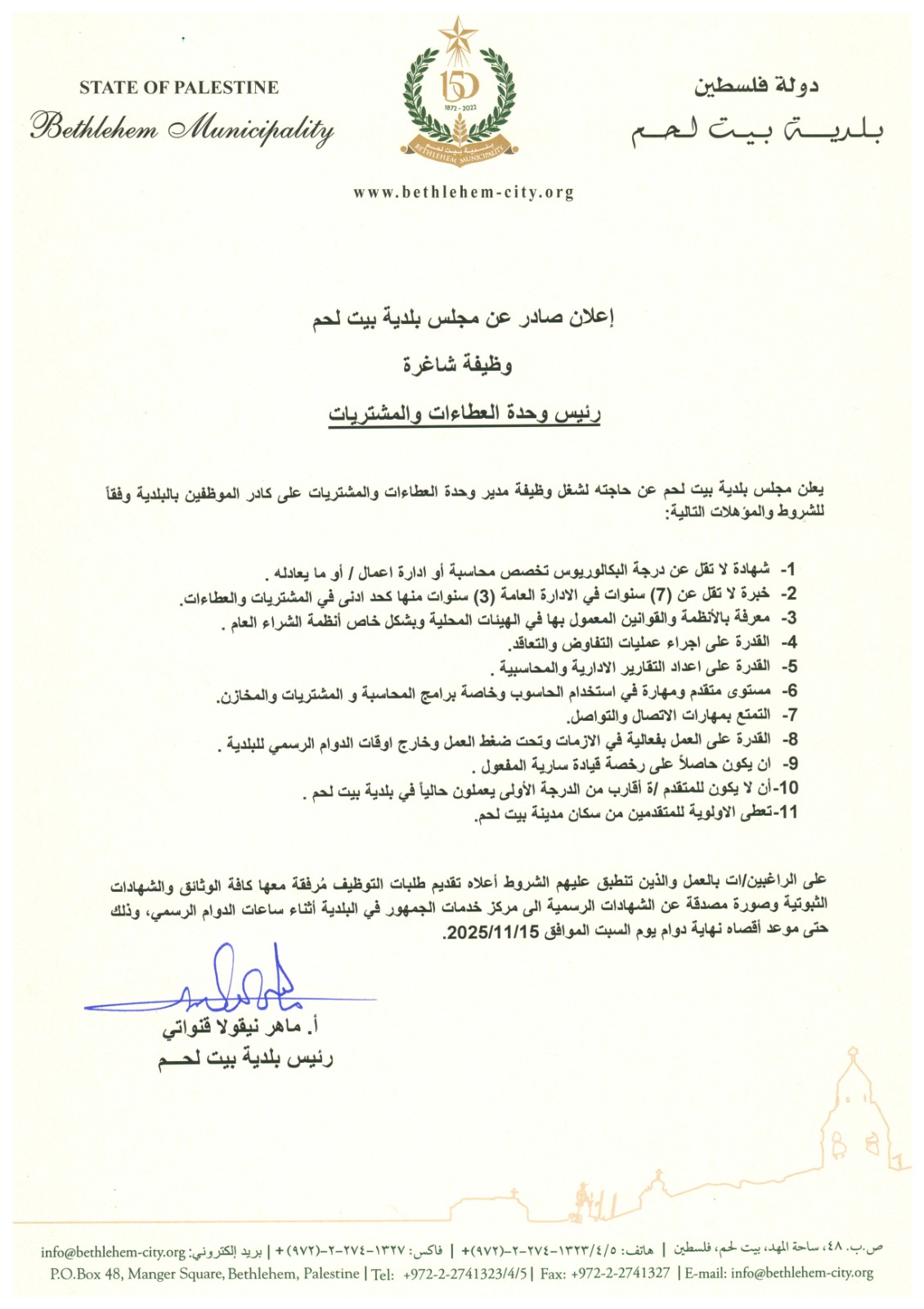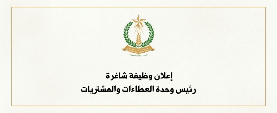 يعلن مجلس بلدية بيت لحم عن حاجته لشغل وظيفة رئيس وحدة العطاءات والمشتريات على أن تتوفر فيه المؤهلات والمواصفات في الإعلان المرفق.