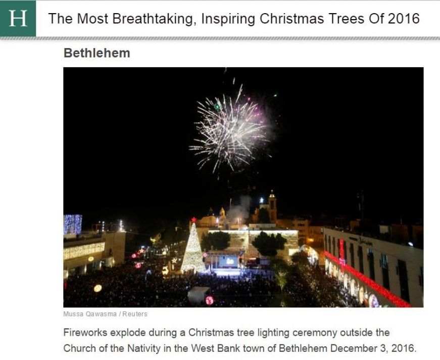 إختار موقع هافينغتون بوست العالمي شجرة عيد الميلاد المجيد في مدينة بيت لحم من بين أكثر الأشجار إلهاماً وتميزاً حول العالم، وهذا ليس العام الأول التي تحتل شجرة الميلاد في بيت لحم مراتب متقدمة عالمياً، حيث زينت الشجرة باللون الذهبي لما له من رمزيةٍ تدلّ على رسالة مدينة بيت لحم وفلسطين التي خُطَّت بحروفٍ من ذهب، كما أكدت رئيسة البلدية الأستاذة فيرا بابون في خطابها في حفل إضاءة شجرة عيد الميلاد المجيد.