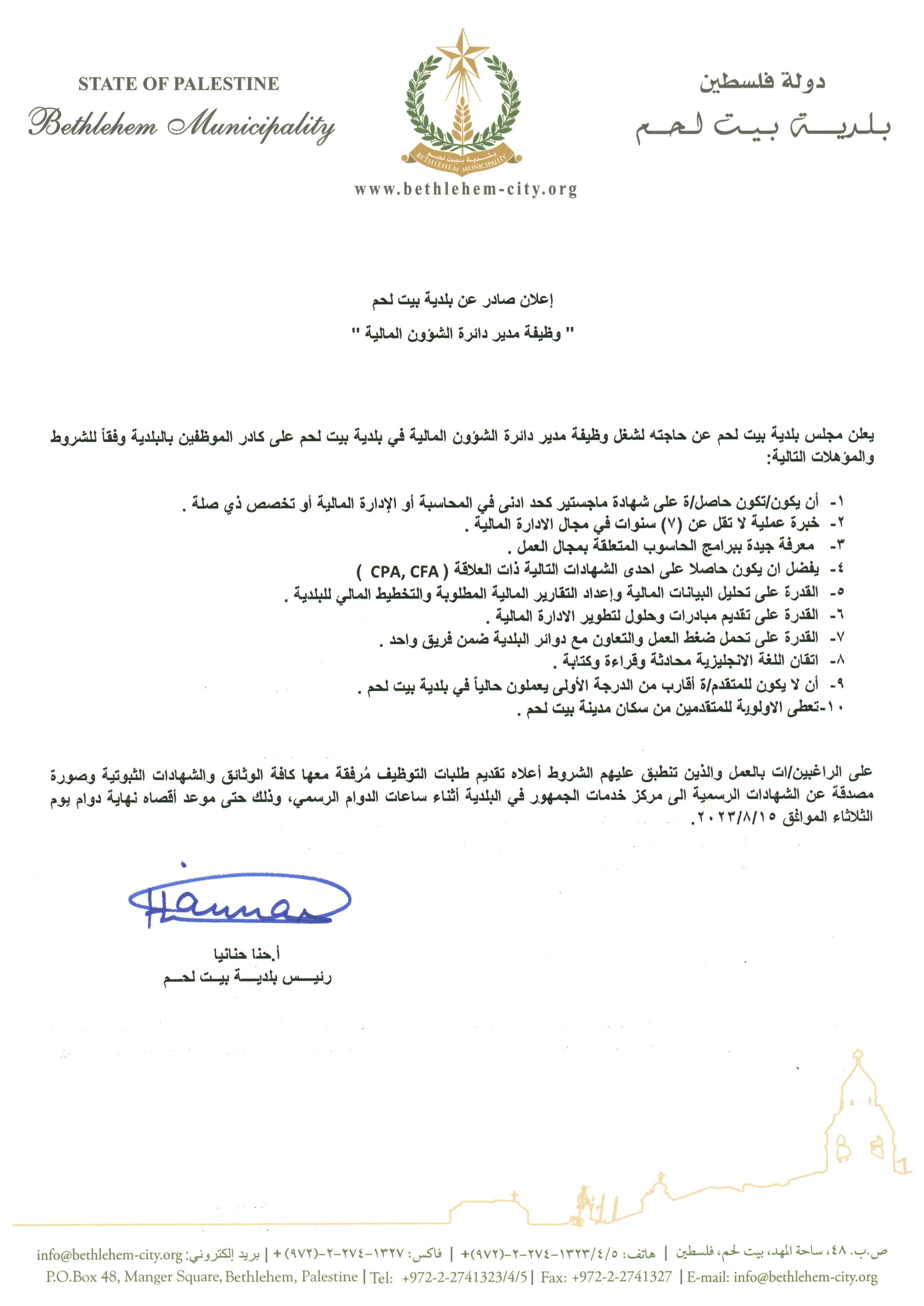 يُعلن مجلس بلدية بيت لحم عن حاجته لشغل وظيفة مدير دائرة الشؤون المالية في بلدية بيت لحم، لمن يرغب بالتقدم للوظيفة يُرجى تقديم كافة الوثائق الرسمية في مركز خدمة الجمهور حتى موعد أقصاه يوم الثلاثاء الموافق 15/8/2023.