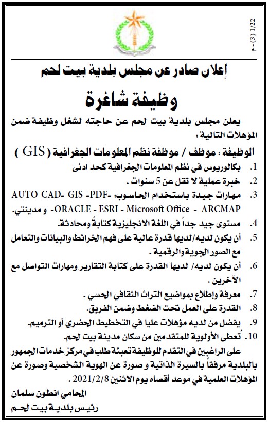 إعلان صادر عن مجلس بلدية بيت لحم - وظيفة شاغرة: موظف/ة نظم المعلومات الجغرافية GIS