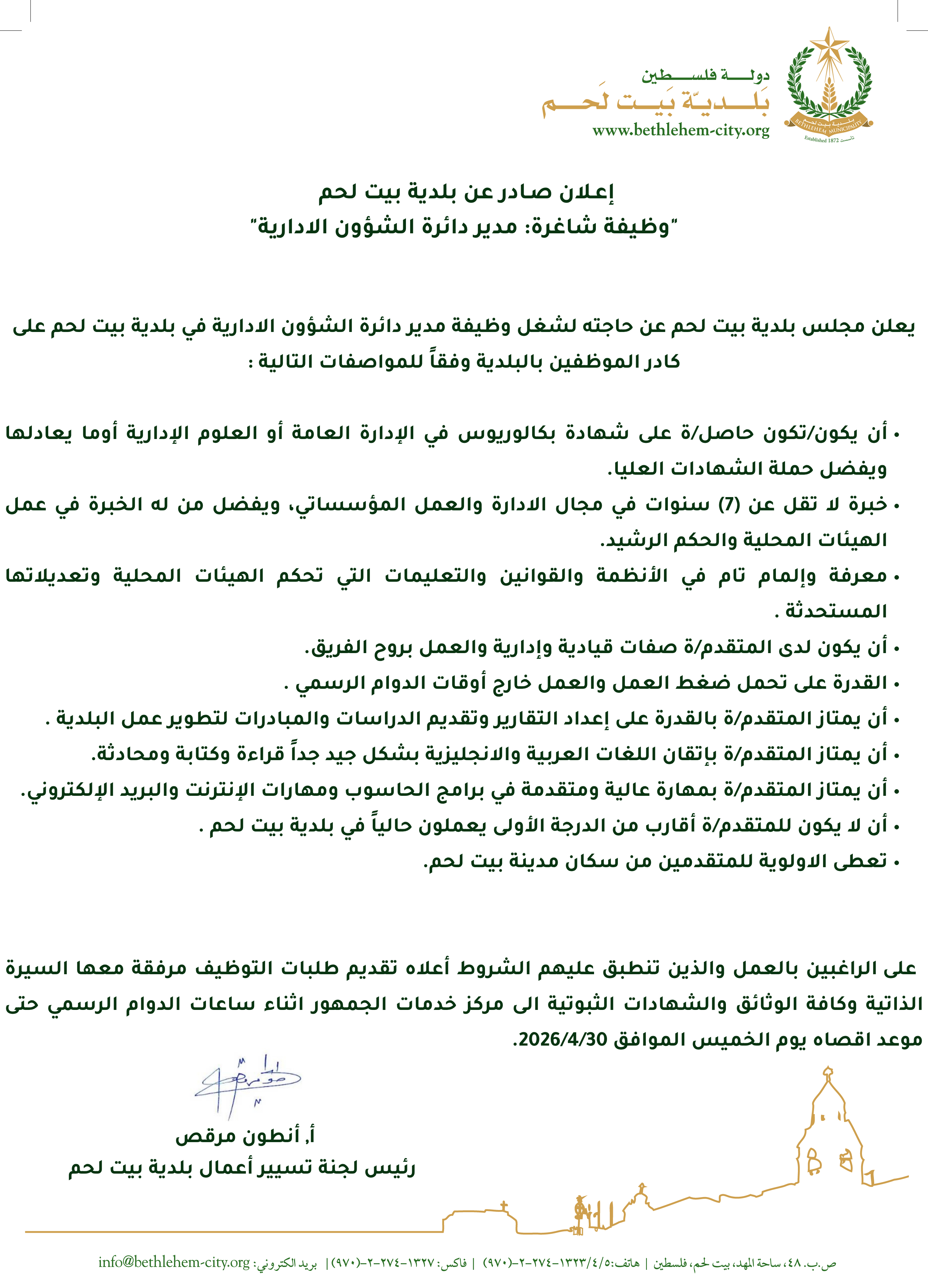 وظيفة شاغرة: "مدير دائرة الشؤون الادارية "