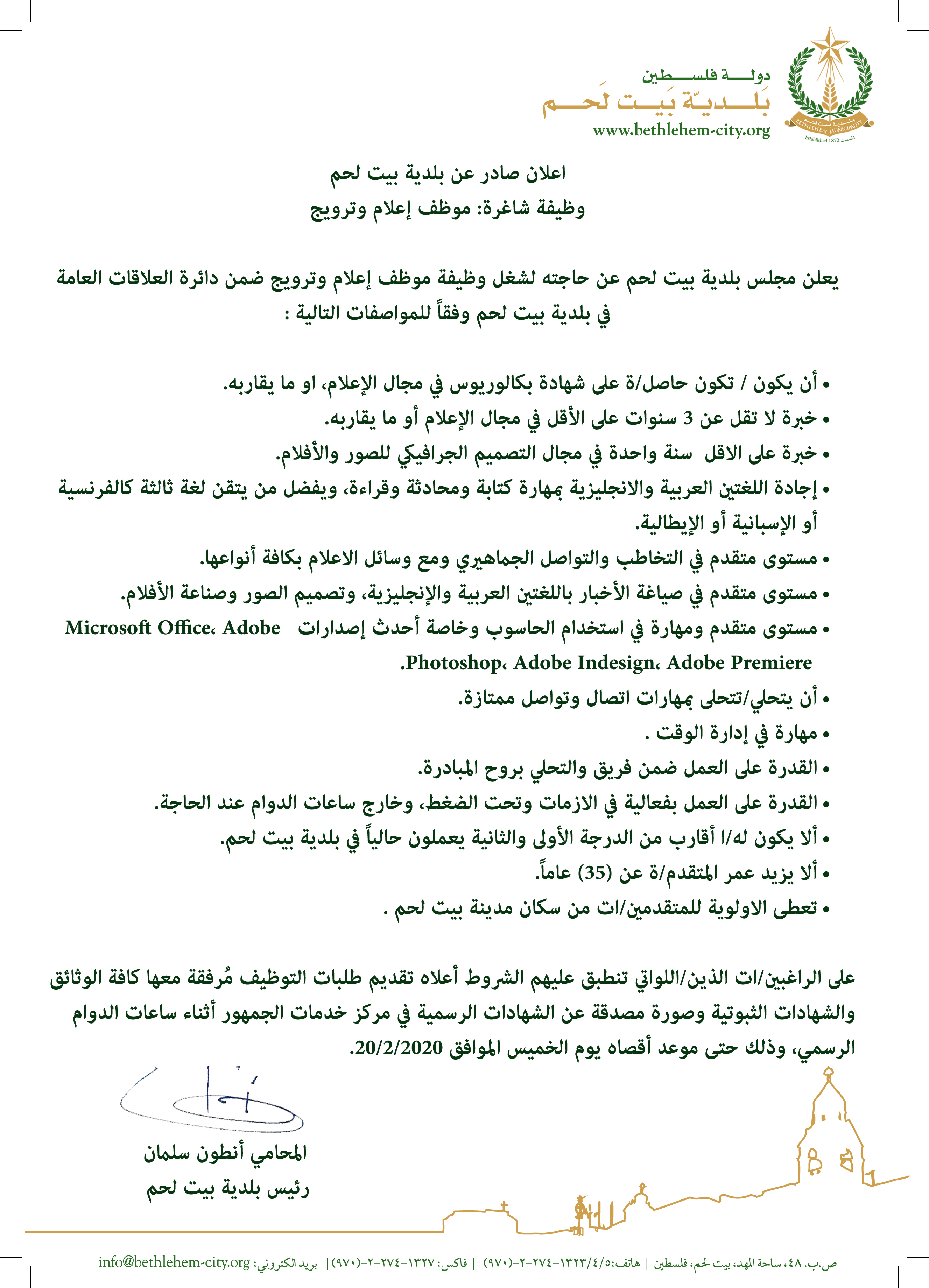 اعلان صادر عن بلدية بيت لحم " وظيفة شاغرة: موظف إعلام وترويج "